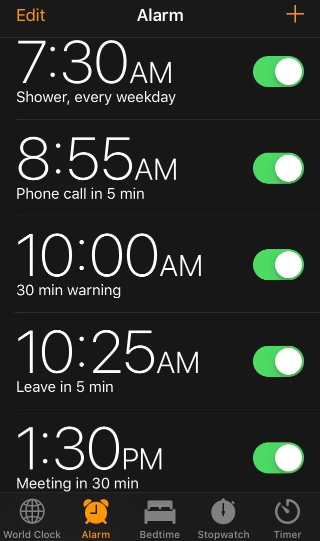 /I recently discovered how incredibly useful the Alarms feature on my iPhone can be. What I used to use it for was setting a timer for an afternoon nap. Now I use it to keep my entire day on schedule (nap no longer included). Perfect for every activity on my list...work, family, social.